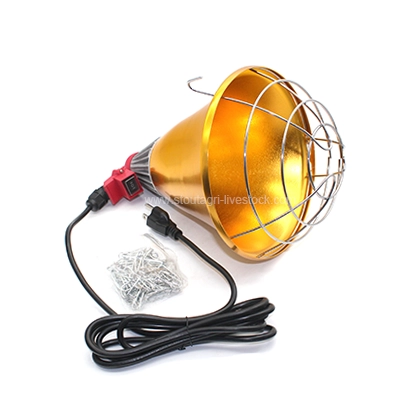 Este portalámparas de calor de calidad comercial proporciona una calidez superior para los viveros de lechones., crianza de aves de corral, y alojamiento para ganado. Con construcción de aluminio resistente con protección de acero galvanizado., Este kit completo incluye cable industrial de 2,5 m y cadena ajustable de 2 m. (la bombilla se vende por separado). El innovador interruptor de tres niveles y la salida giratoria de 360° ofrecen un control preciso de la temperatura para diversas necesidades de los animales..