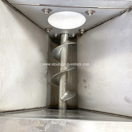 Шнек внутри бункеров обеспечивает количественный выход., регулируется через распределительный щит. Эта функция позволяет точно контролировать количество подаваемого корма., что имеет решающее значение для поддержания надлежащего уровня питания свиней и оптимизации использования корма..
